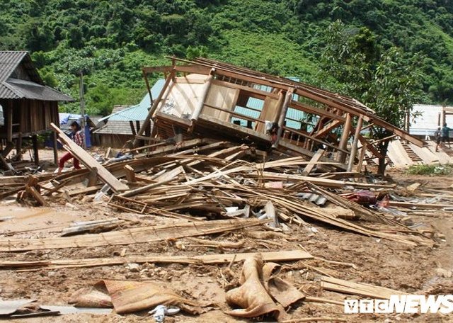 Nước lũ trên núi kèm theo đất đá ồ ạt đổ xuống nhấn chìm bản Poọng (xã Tam Chung, huyện Mường Lát, tỉnh Thanh Hóa) trong đống đổ nát, hoang tàn.