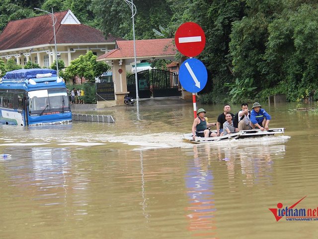 Ngập sâu chia cắt, xe khách chết đắng, thuyền chạy phăng phăng trên quốc lộ