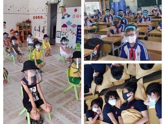 Hình ảnh học sinh đeo tấm kính chắn giọt bắn, đeo khẩu trang kín mít chống COVID-19 trong thời tiết nắng nóng những ngày vừa qua khiến các cháu khó chịu, khổ sở, còn các bậc phụ huynh vô cùng lo lắng.