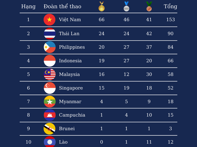 Cập nhật Bảng tổng sắp, bảng xếp hạng huy chương SEA Games 31