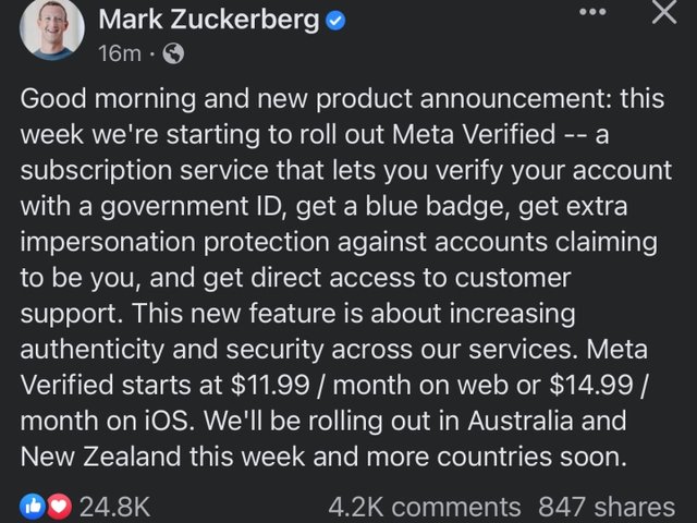 CEO Mark Zuckerberg cho biết Meta chuẩn bị triển khai dịch vụ bán tick xanh xác thực tài khoản với giá từ 11,9 USD/mỗi tháng trên hai nền tảng Facebook và Instagram.