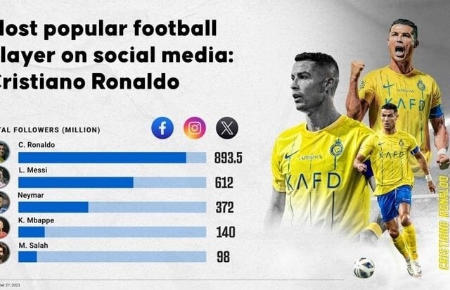 Ronaldo không có đối thủ ở bảng xếp hạng ngôi sao bóng đá có lượng người theo dõi cao nhất thế giới.