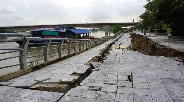 Bờ hữu sông Mã gần chân cầu Hàm Rồng (TP Thanh Hóa) đang bị sạt lở, nhiều mảng bê tông bị xé nát, sụt sâu gần 2 m.