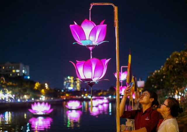 Trước lễ Phật đản, hàng nghìn chiếc đèn được treo dọc bờ kênh Nhiêu Lộc - Thị Nghè, thu hút người dân đến chiêm ngưỡng, chụp ảnh mỗi tối.