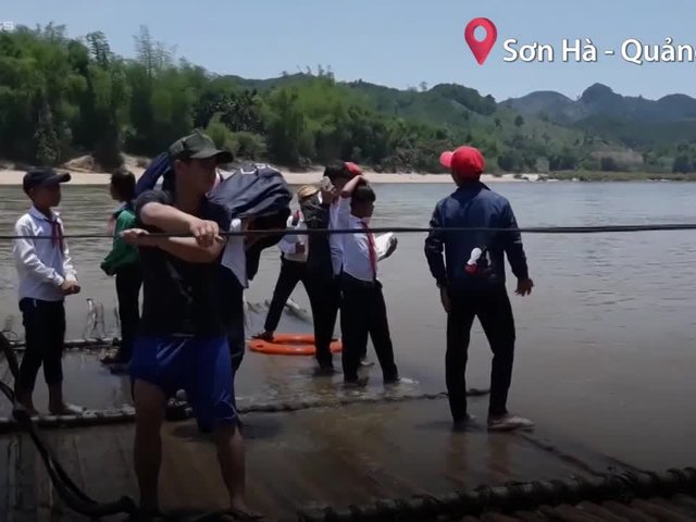 Bị chia cắt bởi sông Rin, hơn 50 em học sinh ở xã Sơn Bao, huyện Sơn Hà phải kéo bè tre hoặc đi đò qua sông đến trường.