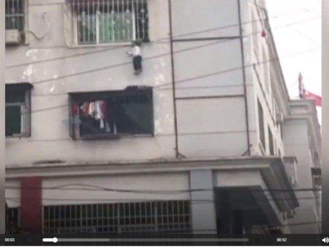 Đoạn clip ghi lại cảnh một bé trai không may kẹt đầu vào song sắt của "chuồng cọp" chung cư và bị treo lơ lửng bên ngoài tòa nhà cao tầng. May mắn một chủ cửa hàng trang sức ở cùng tòa nhà phát hiện ra và nhanh chóng lấy thang giải cứu. Cậu bé được cứu thành công và sức khỏe đang dần hồi phục.