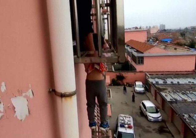 Bé trai 4 tuổi ở tỉnh Sơn Đông bò ra cửa sổ chơi và bị ngã, kẹt đầu trên thanh chắn ngoài cửa sổ, người bị treo lơ lửng.