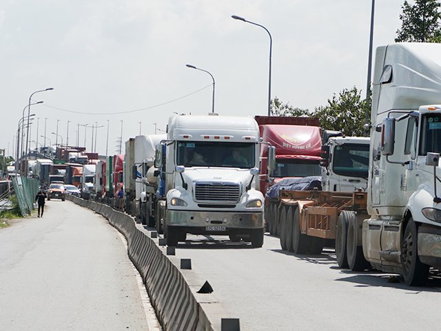 Xe cẩu chắn đường từ cảng Cát Lái (quận 2, cảng lớn nhất nước) ra ngoài, gây kẹt xe lan rộng sang các tuyến đường khác vào giờ cao điểm.