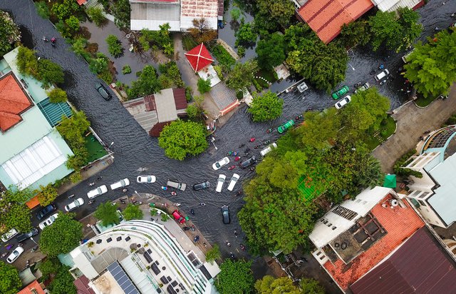 Chiều 7/5, mưa xối xả kéo dài hơn tiếng khiến nước ngập sâu quá bánh xe máy, giao thông rối loạn ở nhiều tuyến đường.