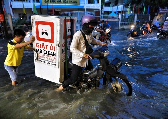 Cơn mưa lớn chiều 9/5 khiến nhiều tuyến đường ở khu Thảo Điền (quận 2) ngập nặng, người dân bì bõm lội nước về nhà.
