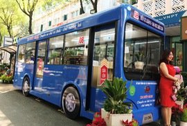 Thư viện thu nhỏ đặt trong xe buýt mô hình, kế bên là trạm chờ mô phỏng với các kệ sách cùng bảng tra cứu thông tin điện tử vừa có tại Đường sách TP HCM.