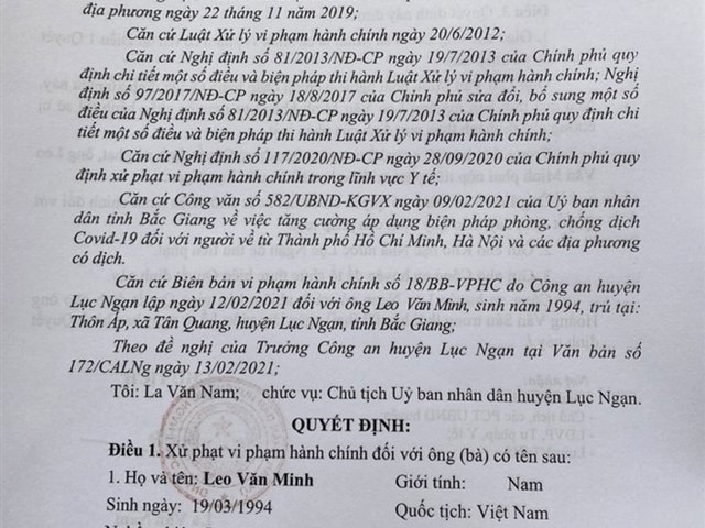 Trở về Bắc Giang từ TP.HCM nhưng không khai báo y tế và thực hiện cách ly phòng COVID-19, Leo Văn Minh bị UBND huyện Lục Ngạn xử phạt 10 triệu đồng.