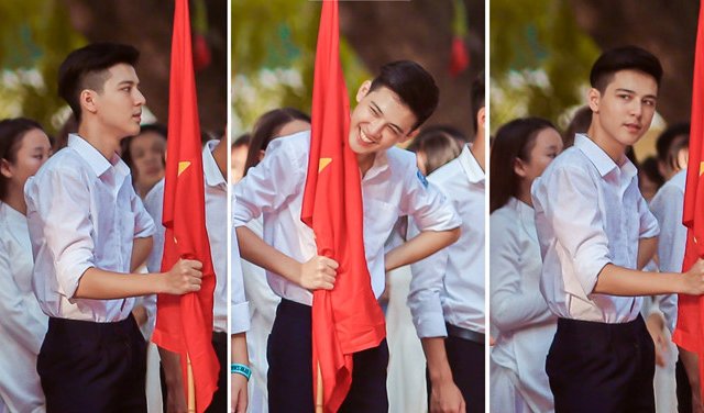 Trong hàng nghìn bức ảnh ngày khai giảng tại trường THPT Phan Đình Phùng, dân mạng chỉ chú ý và tìm kiếm thông tin về một nam sinh đứng đầu hàng, cầm cờ điển trai.