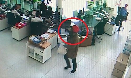 Bị bảo vệ chống trả khi xông vào ngân hàng cướp tiền, hai thanh niên bịt mặt nổ súng uy hiếp rồi lên xe máy tẩu thoát.