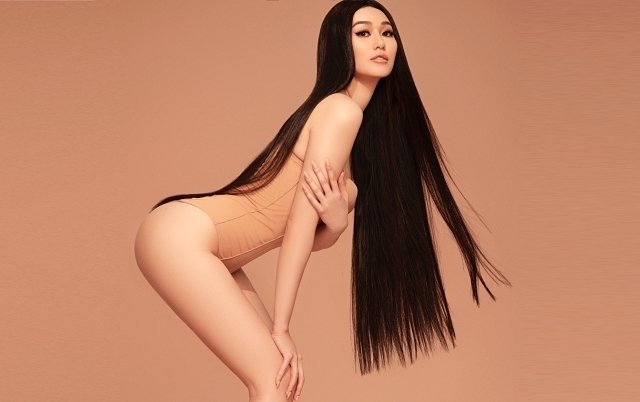Người mẫu Khánh My khoe thân hình 88-59-100 cm trong bộ ảnh mới và tiết lộ đang tập để vòng ba tăng lên 110 cm.