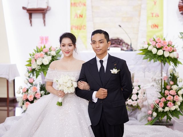 Trước đám cưới, vợ chồng Khánh Thi và Phan Hiển đã có buổi lễ thực hiện các nghi thức cưới tại nhà thờ.