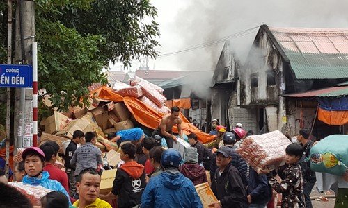 Hơn 13h ngày 9/12, dãy nhà kho đựng hàng tạp hóa phía sau chợ Vinh (Nghệ An) bốc cháy, hàng trăm người nhanh chóng di dời tài sản.