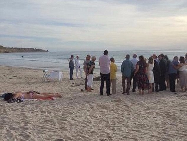 Ảnh cho thấy cô gái nằm úp trên bãi biển, nơi một cặp đôi đang tổ chức đám cưới.