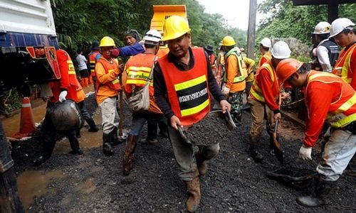 Đội cứu hộ và các tình nguyện viên phối hợp ăn ý với nhau tạo nên bầu không khí thân tình tại nơi giải cứu đội bóng nhí Thái Lan.