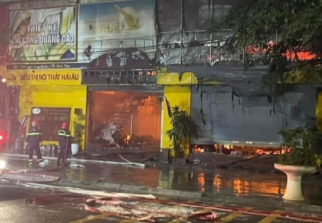 Khu chợ tự phát Vina Khai Quang ở Vĩnh Phúc bốc cháy lúc rạng sáng khiến hơn 10 ki ốt và 2 ô tô chở hàng bị thiêu rụi.