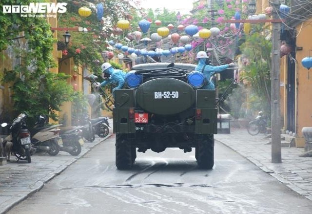 Bộ Quốc phòng phối hợp Quân khu 5 triển khai lực lượng 6 xe chuyên dụng của quân sự cùng 32 quân nhân phun tiêu độc khử trùng phố cổ Hội An.