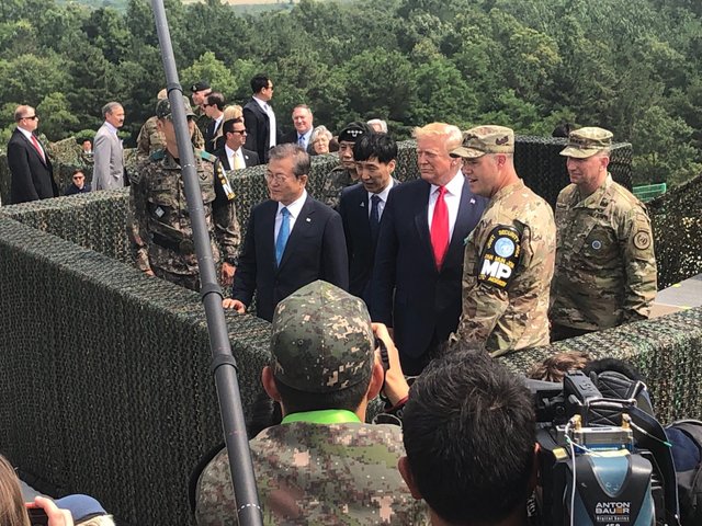 Chiều ngày 30/6, Tổng thống Mỹ Donald Trump và Tổng thống Hàn Quốc Moon Jae-in đã đến thăm vùng phi quân sự (DMZ) nằm giữa biên giới hai miền Triều Tiên, chờ đợi cuộc gặp gỡ lịch sử giữa lãnh đạo Mỹ - Triều tại đây.