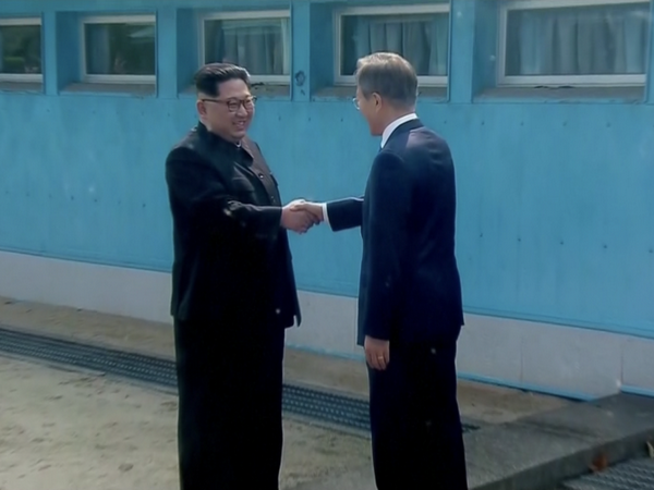 Lãnh đạo Hàn - Triều bắt tay khi hai người đứng ở hai bên đường ranh giới rồi họ cùng nhau bước sang phía bắc và phía nam, nơi hội nghị thượng đỉnh diễn ra.