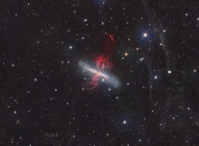 "Thiên hà xì gà" M82 gây chú ý với hình dạng kéo dài đặc trưng và những dòng vật chất lan tỏa, phản ánh môi trường năng động trong không gian sâu thẳm.