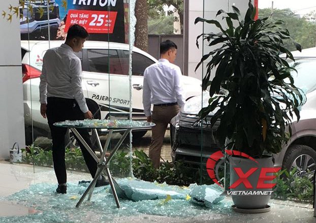 Đạp nhầm chân ga, anh Trần V.D, khách lái thử Mitsubishi Xpander ở Hà Nội đã tông thẳng showroom khiến đầu xe hư hại nặng. Phí sửa chữa lên tới 100 triệu đồng.