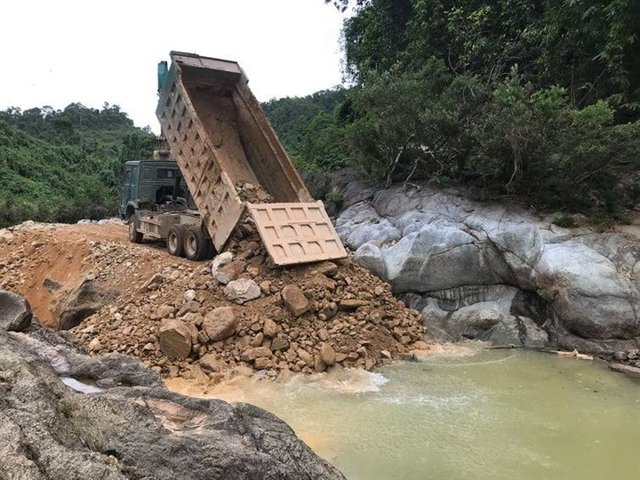 Dù thời tiết xấu nhưng lực lượng chức năng vẫn nỗ lực lấp suối, làm đường để triển khai giai đoạn 7 tìm kiếm 11 công nhân còn mất tích ở Rào Trăng 3.