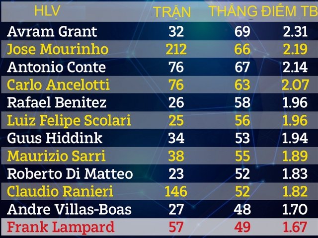 Tỷ lệ thắng nhỉnh hơn Villas-Boas, nhưng Lampard có điểm trung bình trận tại Ngoại hạng Anh thấp hơn cả trong số 12 HLV Chelsea gần nhất.