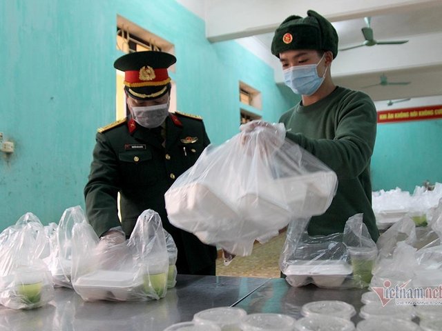 Cán bộ chiến sỹ Trung đoàn 123 (Bộ chỉ huy quân sự tỉnh Lạng Sơn) nhiều ngày nay tất bật chuẩn bị khẩu phần ăn cho hàng trăm người từ Trung Quốc trở về cách ly tại đơn vị.
