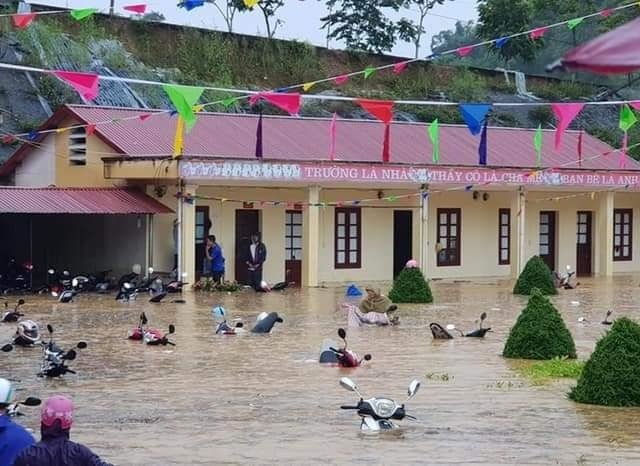 Mưa lớn, trường học Lào Cai ngập sâu, 100 xe máy của giáo viên bị nhấn chìm
