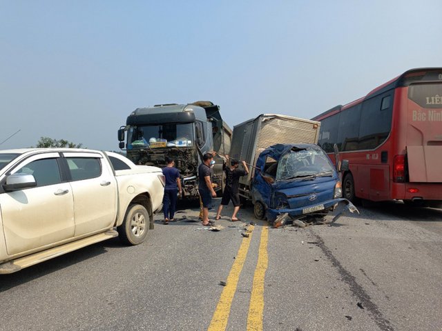 Tai nạn liên hoàn xảy ra sau khi xe tải tông vào đoàn xe đang dừng đỗ theo hiệu lệnh phân luồng khi đi qua đoạn đường được sửa chữa trên cao tốc Nội Bài - Lào Cai.