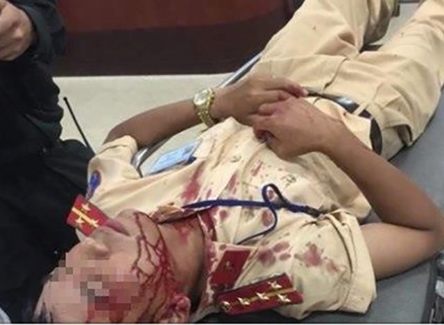 Đang giải quyết vi phạm không đội mũ bảo hiểm, Hùng vơ cục gạch ở ven đường đập nhiều nhát vào vị đại uý cảnh sát.