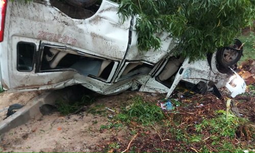 Ôtô 16 chỗ bẹp rúm khi lật ngửa trong cơn mưa lớn