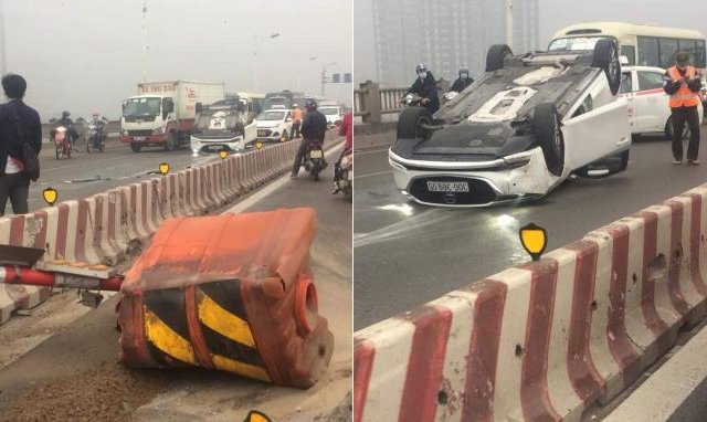 Hà Nội: Nữ tài xế tông vào dải phân cách, ô tô lật ngửa trên cầu Vĩnh Tuy
