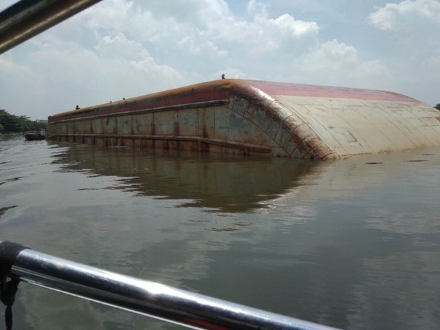 Đang đưa hàng lên bờ, chiếc sà lan nặng khoảng 1.200 tấn bất ngờ bị nghiêng và lập úp trên sông Sài Gòn.