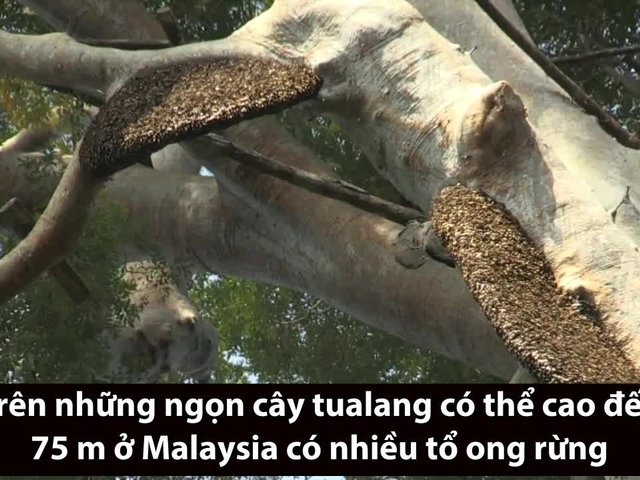 Hàng nghìn con ong rừng ùa ra khỏi tổ tấn công khi nhóm thợ săn Malaysia mặc đồ bảo hộ trèo lên ngọn cây cướp mật.