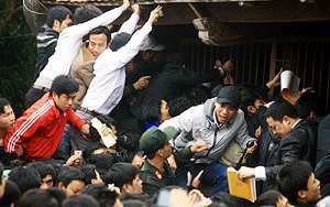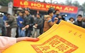 Nhiều người cố chen lấn, xô đẩy từ bên ngoài để vào trong xin ấn đền Trần (Nam Định) trong sáng 15 tháng Giêng, song số ấn xin được nhiều hay ít là do mức độ tiền công đức.