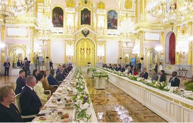 Khách quý tham dự tiệc tối kỷ niệm Ngày Chiến thắng do Tổng thống Nga Vladimir Putin tổ chức thưởng thức nhiều món ăn truyền thống của Nga.
