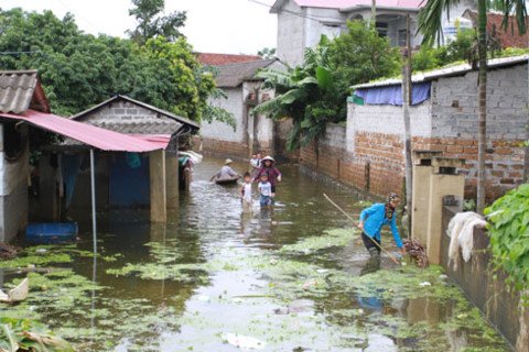Thầy giáo khiêng xe máy băng qua nước lũ đến trường
