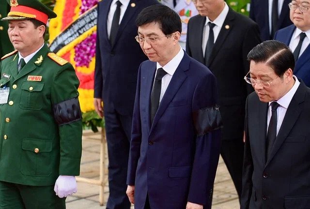 Chủ tịch Chính hiệp Trung Quốc Vương Hỗ Ninh đeo băng tang dẫn đầu đoàn Cộng hòa Nhân dân Trung Hoa vào kính viếng Tổng Bí thư Nguyễn Phú Trọng.