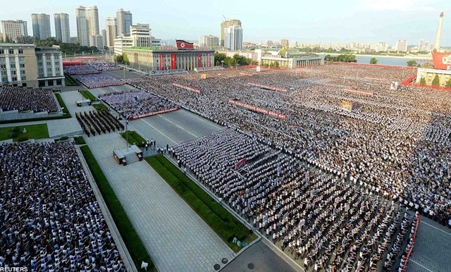 Hàng chục nghìn người Triều Tiên đã tập trung tại Quảng trường Kim Il Sung (Bình Nhưỡng) hôm 9-8 (giờ địa phương) để tham gia cuộc biểu tình chống lại lệnh trừng phạt mới nhất từ Liên Hợp Quốc.