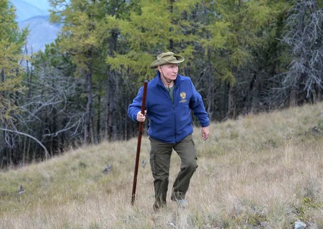 Ong Putin đội mũ, đeo kính đen trong chuyến leo núi tại khu rừng Taiga ở Siberia cùng Bộ trưởng Quốc phòng Nga Sergei Shoigu.