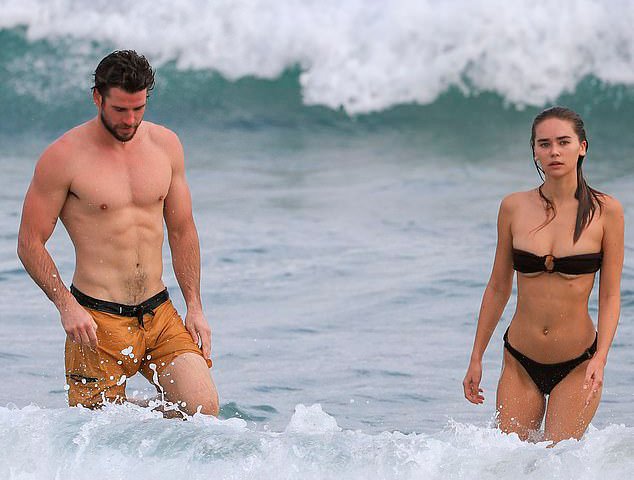 Tài tử Liam Hemsworth cởi trần khoe thân hình cường tráng trong khi người mẫu 23 tuổi Gabriella Brooks diện bikini nhỏ xíu ở vịnh Byron cuối tuần qua.