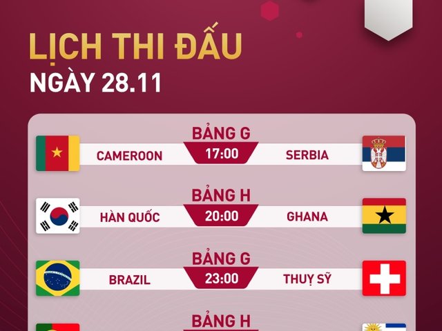 Cập nhật lịch thi đấu World Cup 2022 mới nhất hôm nay 28/11.