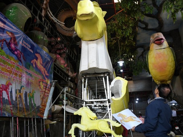 Các linh vật, tiểu cảnh Tết Bính Ngọ 2026 đang được các nghệ nhân, công nhân hoàn thiện để mang trưng bày ở Đường hoa Nguyễn Huệ (thi công vào tháng 2-2026).