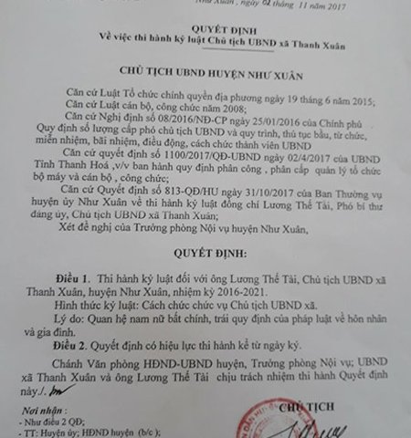 Sau khi bị cách hết các chức vụ trong Đảng, ông Lương Thế Tài tiếp tục bị UBND huyện Như Xuân thi hành kỷ luật cách chức Chủ tịch UBND xã Thanh Xuân nhiệm kỳ 2015-2020