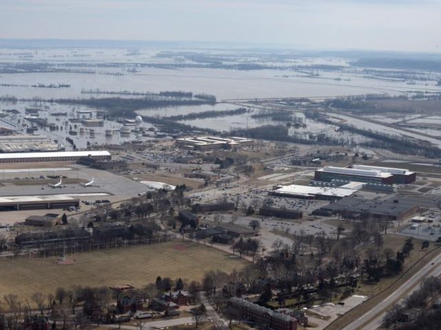 Lượng nước lớn đổ về vùng Tây Trung Mỹ nhấn chìm căn cứ không quân Offutt gần Omaha, Nebraska trong biển nước.